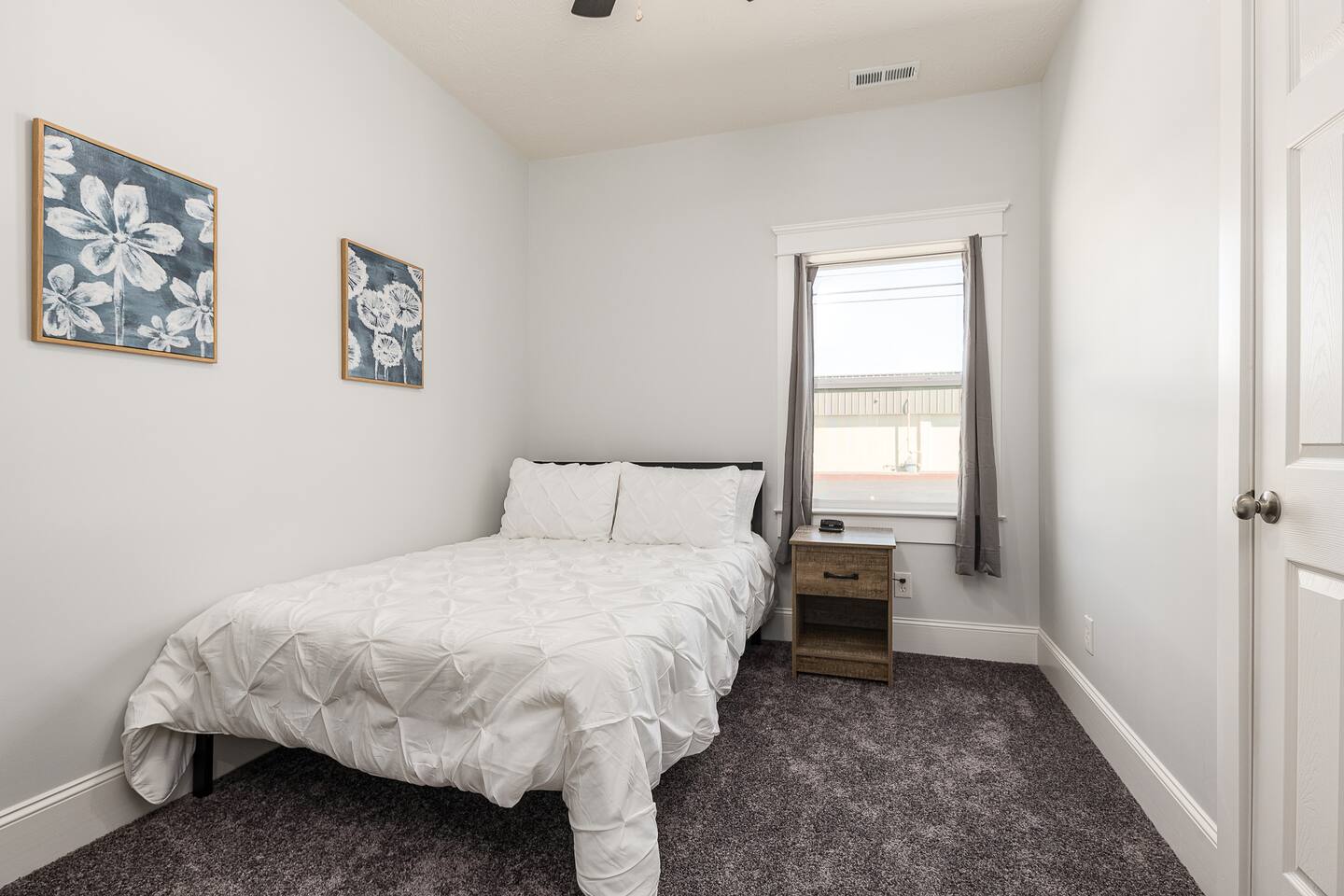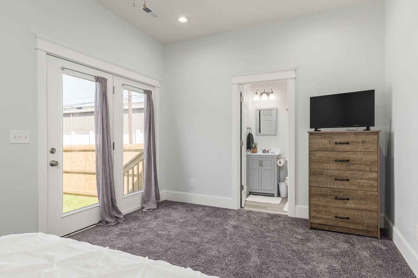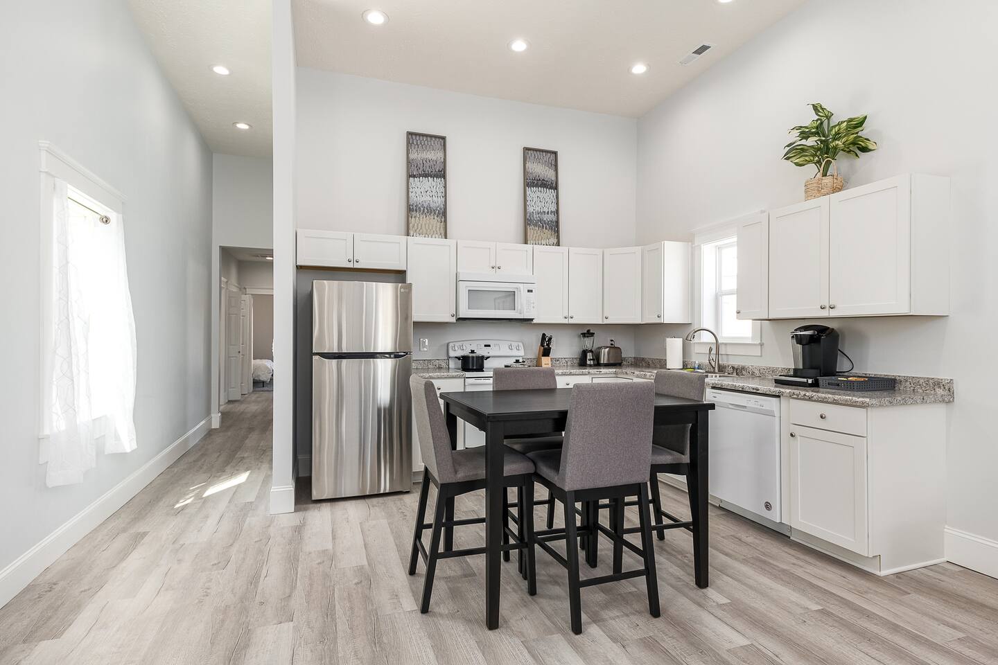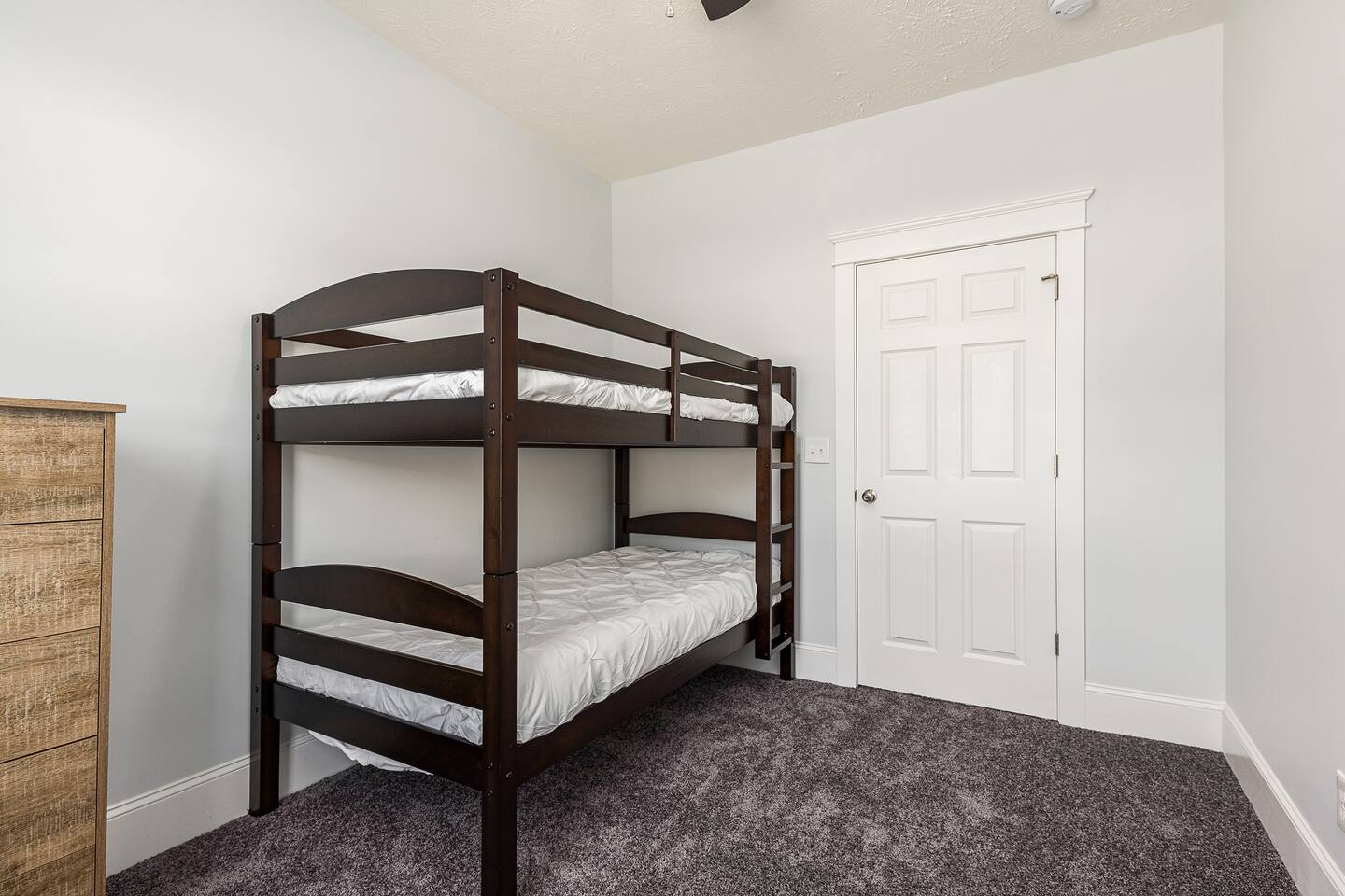 The property features an open concept living/dining/kitchen. The backyard is fully fenced with additional parking behind the house. The primary bedroom has a Queen bed and an en suite bathroom. Bedroom 2 has a full bed while bedroom three is a bunk bed featuring two twins.