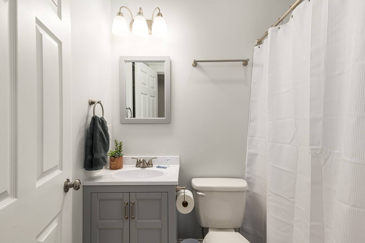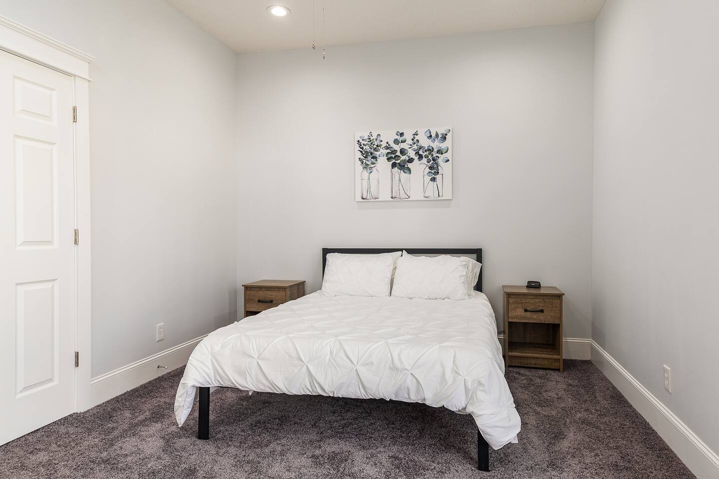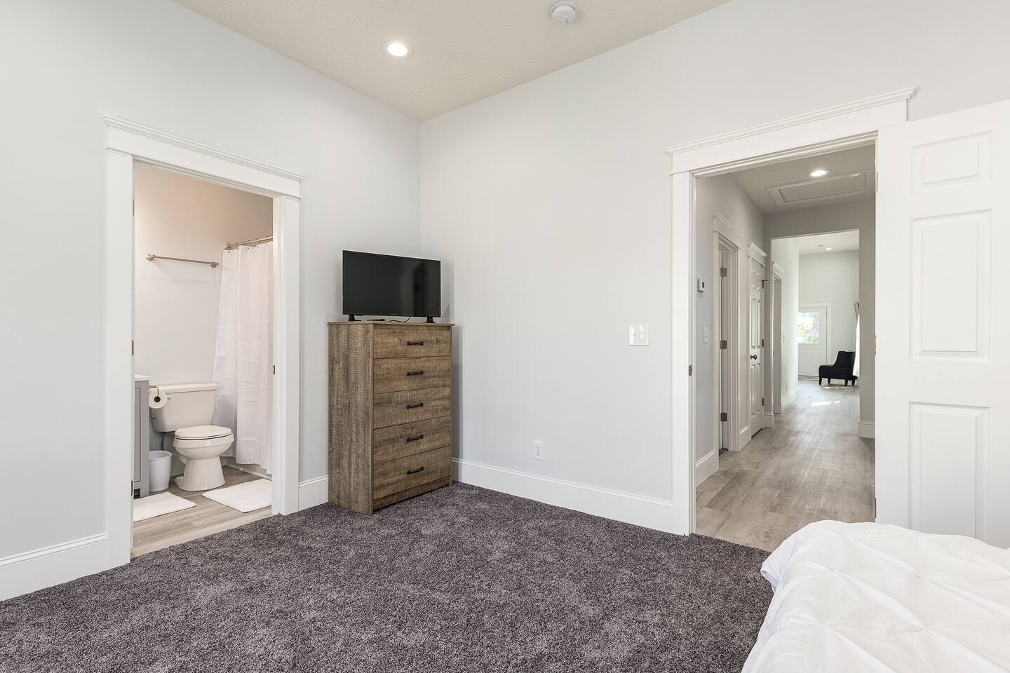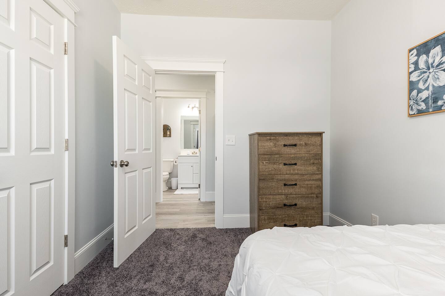 The property features an open concept living/dining/kitchen. The backyard is fully fenced with additional parking behind the house. The primary bedroom has a Queen bed and an en suite bathroom. Bedroom 2 has a full bed while bedroom three is a bunk bed featuring two twins.